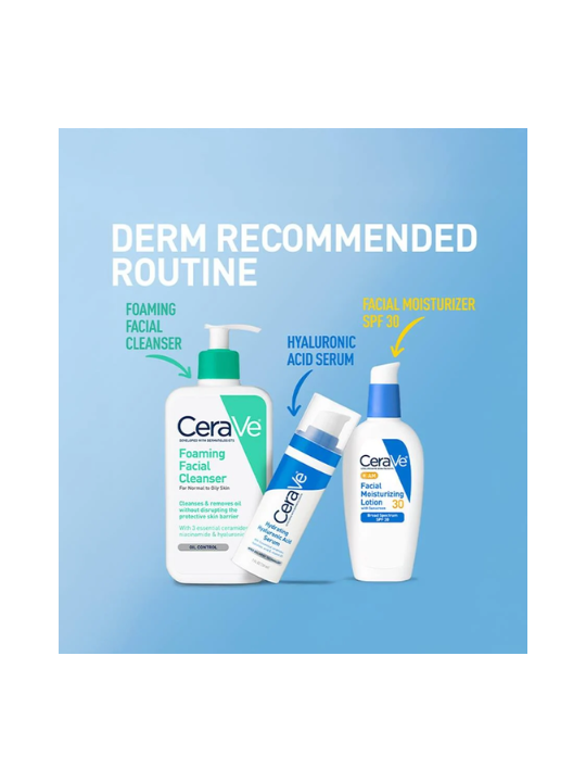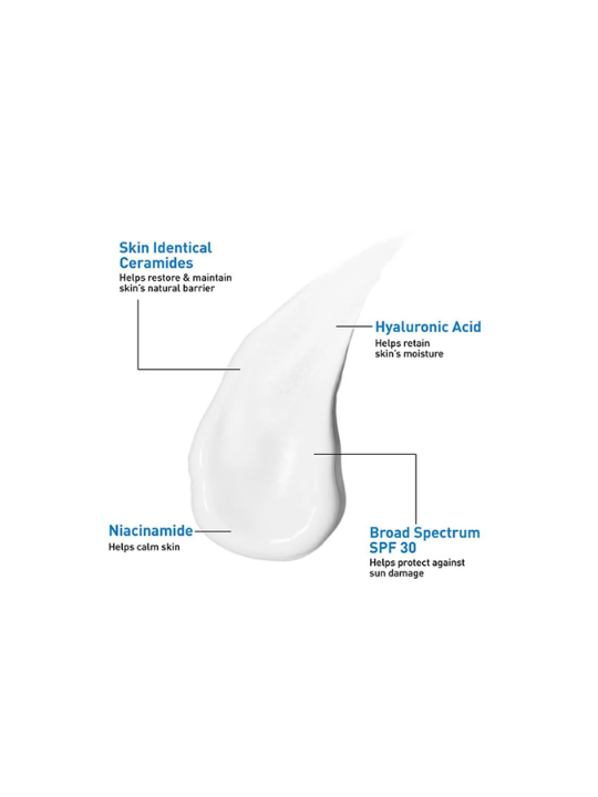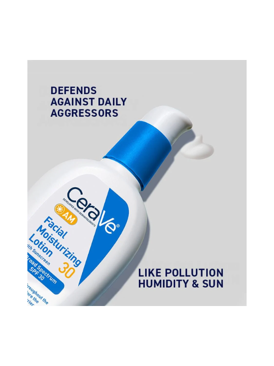 CeraVe AM Facial Moisturizer with broad spectrum SPF 30 sunscreen is a morning skincare multitasker that provides continuous hydration throughout the day while helping to absorb and reflect the sun’s damaging UVA and UVB rays and restore the skin’s protective barrier.
