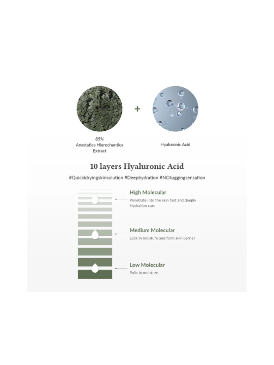 Anastatica Hierochuntica Extract, Water, 1,2-Hexanediol, Butylene Glycol, Glycerin, Dipotassium Glycyrrhizate, Ammonium Acryloyldimethyltaurate/VP Copolymer, Disodium EDTA, Allantoin, Citric Acid, Sodium Citrate, Malt Extract, Adansonia Digitata Seed Extract, Anthemis Nobilis Flower Extract, Opuntia Ficus-Indica Stem Extract, Portulaca Oleracea Extract, Sodium Hyaluronate, Hydroxypropyltrimonium Hyaluronate, Hydrolyzed Hyaluronic Acid, Sodium Acetylated Hyaluronate, Hyaluronic Acid, Hydrolyzed Sodium Hyaluronate, Sodium Hyaluronate Crosspolymer, Potassium Hyaluronate