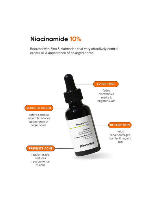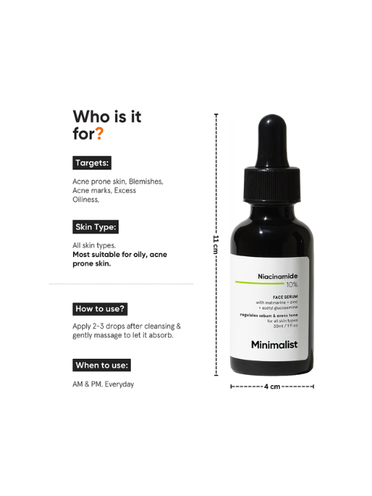 The Minimalist 10% Niacinamide Face Serum is a powerful, lightweight serum formulated to regulate sebum production, reduce acne scars, brighten skin, and strengthen the skin barrier. Infused with 10% Niacinamide (Vitamin B3), this serum helps fade dark spots, minimize pores, and improve skin texture. It also contains 1% Zinc PCA to control excess oil, prevent breakouts, and fight acne-causing bacteria. Enriched with Hyaluronic Acid & Centella Asiatica Extract, it hydrates, soothes, and repairs the skin, making it ideal for oily, acne-prone, and combination skin types.