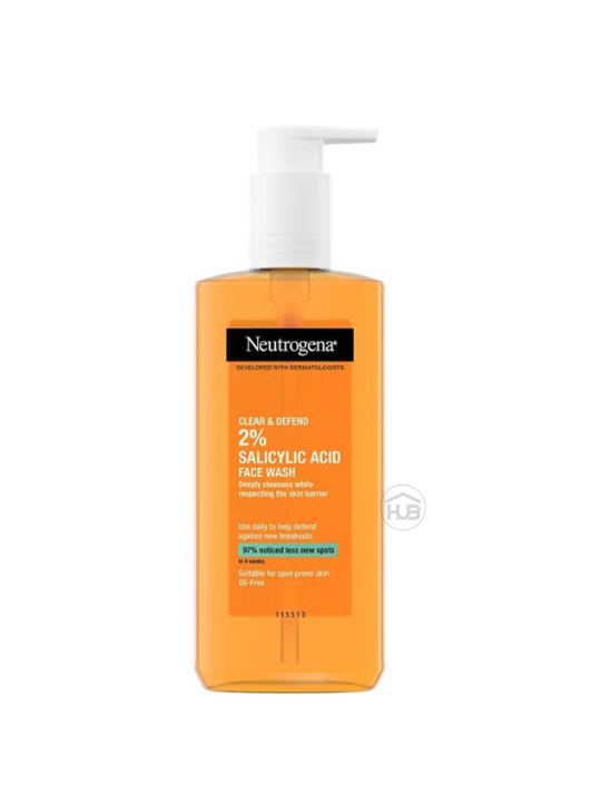 - Neutrogena Clear & Defend 2% Salicylic Acid Face Wash cleanses spot-prone skin and is clinically proven to help prevent future breakouts.