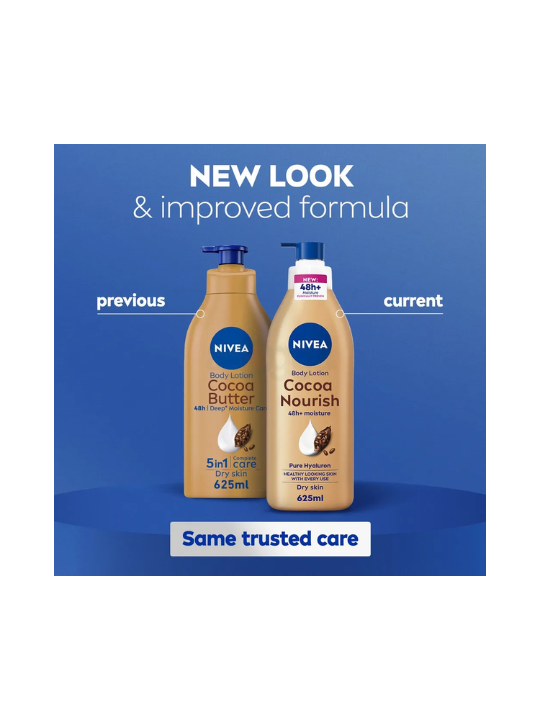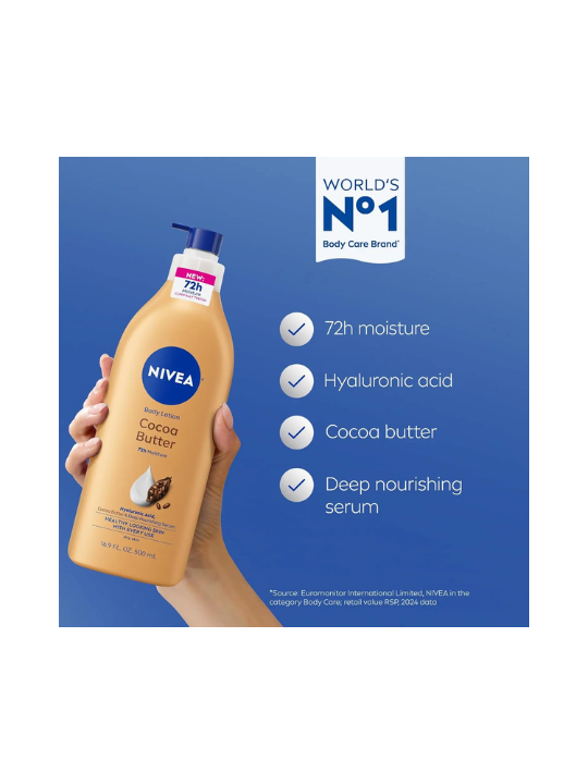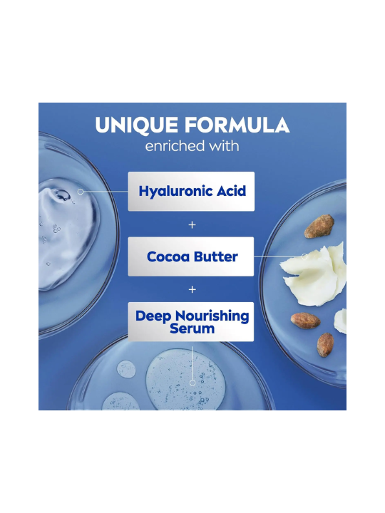 NIVEA Body Lotion Cocoa Nourish is specially formulated to provide long-lasting hydration and nourishment for dry skin. Infused with Cocoa Butter, Shea Butter, Hyaluronic Acid, and NIVEA’s Deep Nourishing Serum, this lotion deeply moisturizes for up to 72 hours, leaving skin noticeably soft, smooth, and radiant. Suitable for both women and men, it can be used as a body, hand, or foot lotion. With more than 110 years of skincare expertise, NIVEA delivers trusted care with every application.