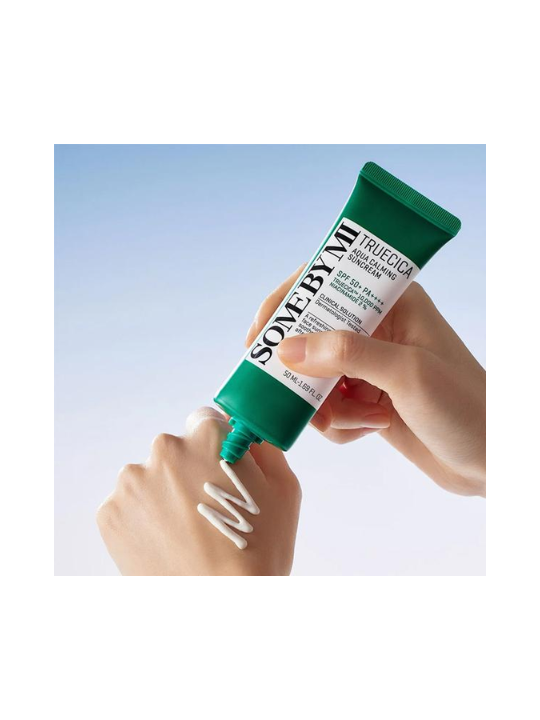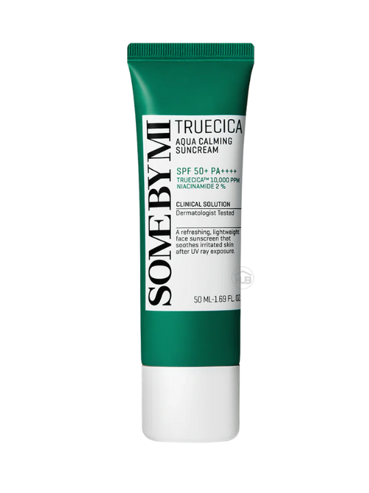 Some By Mi Truecica Aqua Calming Suncream is a K-beauty sunscreen that provides broad-spectrum protection against both UVA and UVB rays. This sunscreen is designed to calm and soothe the skin while protecting it from the damaging effects of the sun.The Truecica Aqua Calming Suncream is formulated with a blend of active ingredients that help to soothe and hydrate the skin, including centella asiatica extract, tea tree leaf water, and 10,000 ppm of truecica. Truecica is a patented ingredient developed by Some By Mi that combines the skin benefits of tea tree, centella asiatica, and mugwort extracts to provide a powerful calming effect on the skin.