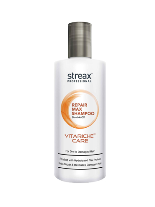- The new Streax Professional Vitariche care Repair Max shampoo is a Cleansing shampoo that helps revitalize dry, distressed hair with a surge of nourishment from Biovit-A-OX complex - a combination of Biotin and antioxidant-rich Vitamin B5 and Vitamin E. Hydrolysed Flax Protein and Ceramide mimic molecules help repair and rejuvenate rough, damaged hair. Result: Healthy-looking, replenished hair with Vitariche Care Repair max range.